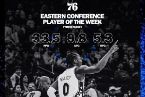 上周马克西率领76人取得3胜1负的战绩,场均轰下33.5分5.3篮板9.8助攻。