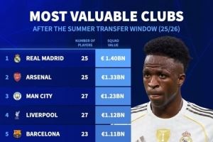 夏窗结束后俱乐部身价排名: