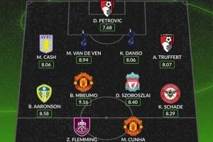 后卫:卡什(阿斯顿维拉,8.06分)、范德芬(热刺,8.94分)、丹索(热刺,8.06分)、阿德里安-特吕费尔(伯恩茅斯,8.07分)