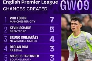 体育资讯10月28日讯 英超第9轮战罢,据Squawka数据统计,福登是本轮创造机会次数最多的球员,共计7次。