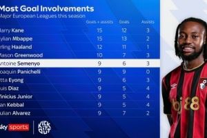 体育资讯11月2日讯 天空体育盘点了本赛季欧洲主流联赛球员参与进球榜(进球+助攻),以下为具体榜单(只统计联赛):